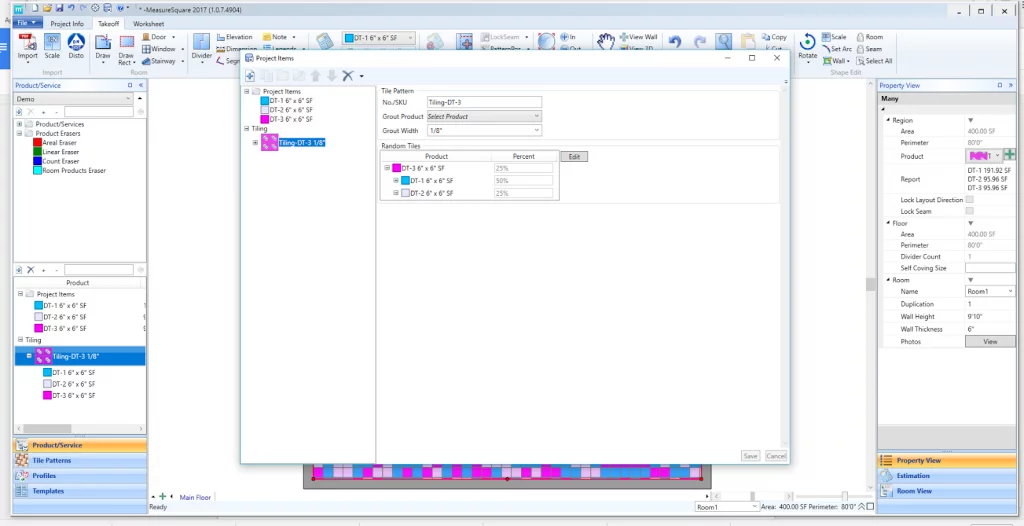 Another major request we have gotten is the ability to create random tile patterns within the program, without having to manually change tiles on the takeoff. The latest version of the desktop software now allows you to assign a random tile pattern by setting the percentage of the different tiles used in the takeoff. As you can see in the image above, you will be able to create unique tile patterns without spending large amounts of time manually adding different tiles to create the patterns yourself.
