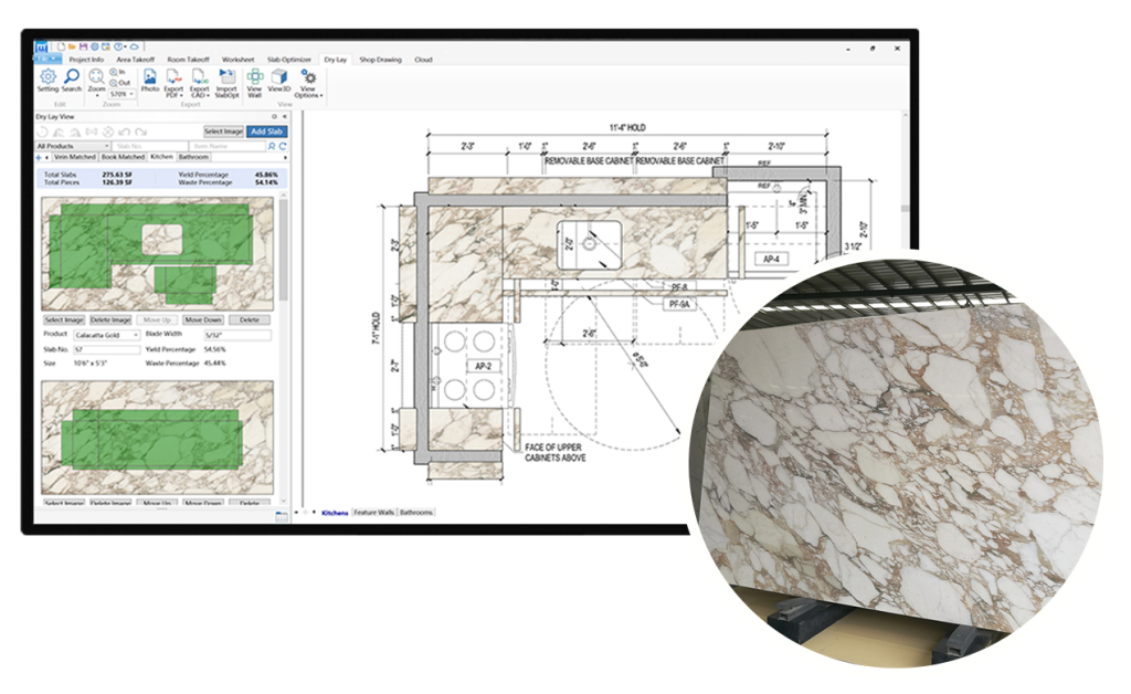 • Win more jobs with detailed design layouts, slab optimization, vein matching and dry lay, tile pattern design, and 3D visualization. Built-in product catalogs and labor costs enable fast, accurate estimates.