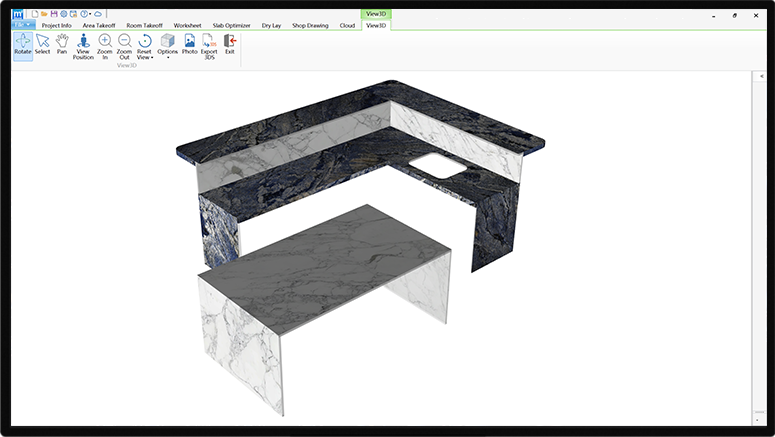 Review design in a 3D model Display countertops, rooms and wall elevations in a 3D model where you can see the veins and pan, zoom, and rotate the plan.