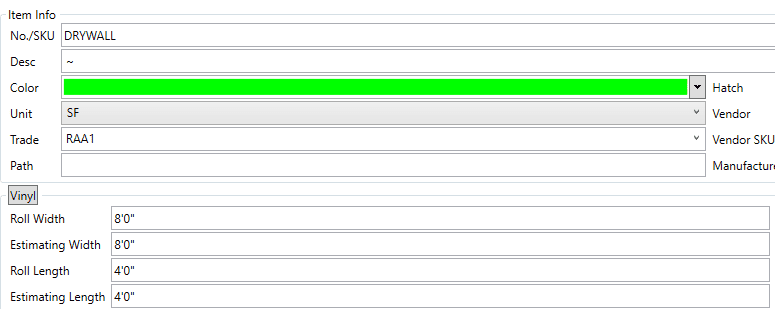 At first glance, this list seems to cater only to flooring. The “Vinyl” item type can only be used for sheet vinyl, right? Wrong. Each of these item types holds different properties that enable us to measure the given product correctly. Learning the differences between these types gives us a foundation for understanding how to complete takeoffs in other trades.